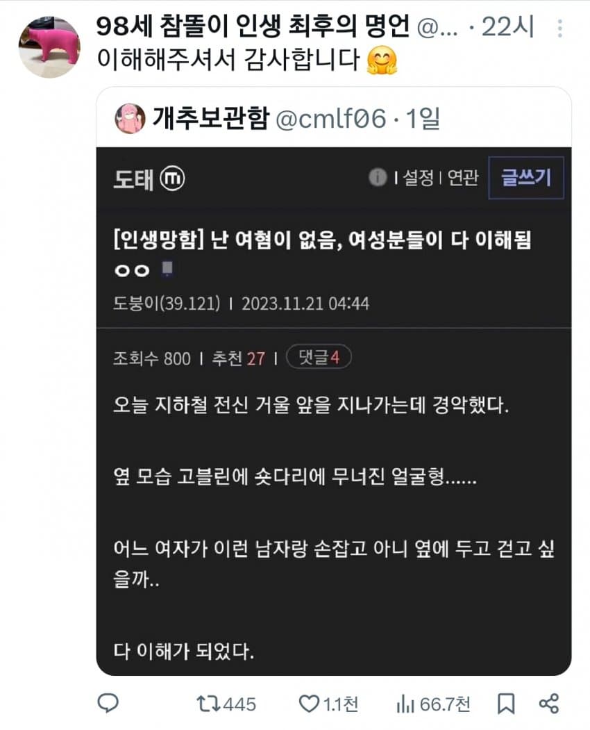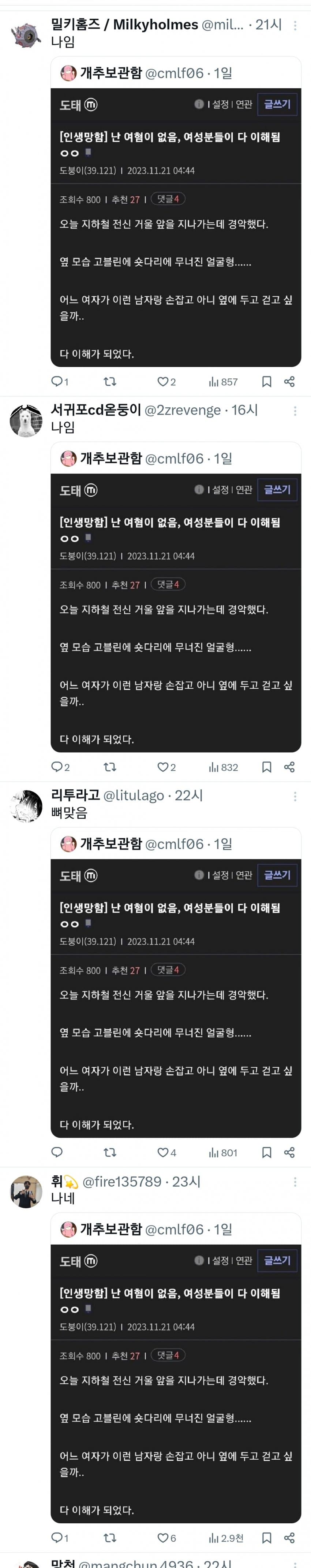 이거 계집년들이 주작글 쓰고 남자 도태되면 이렇게 된다고 선전하는건데. 트위터 일본 페미주작이랑 같은거임