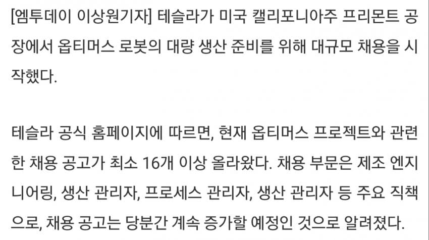 또한 기존 테슬라 프리몬트 공장 내부에서도 옵티머스 로봇들이 생산/테스트 중이며, 프리몬트 공장의 옵티머스 관련 엔지니어 채용도 늘려 생산 역량 확대를 준비하고 있음
