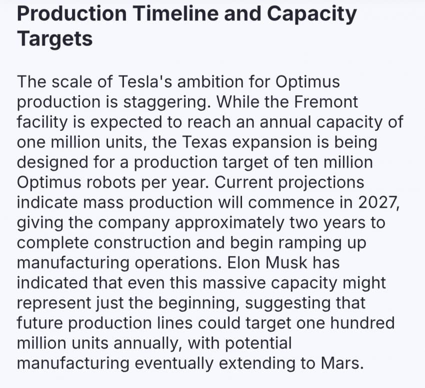 해당 텍사스 공장은 2027년에 가동 시작 예정이고, 점차 생산량을 늘려 최종적으로 연간 1,000만대의 옵티머스 로봇을 생산할 계획임.