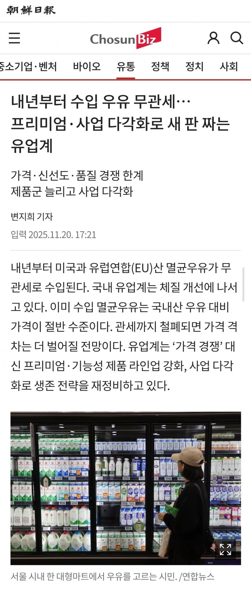 한-eu FTA를 찢이했냐. 유럽산 우유는 2011년 33.8%에서 2024년 4.5%, 2025년 2.3%로 관세율이 꾸준히 감축됐고 내년엔 무관세로 들어온다