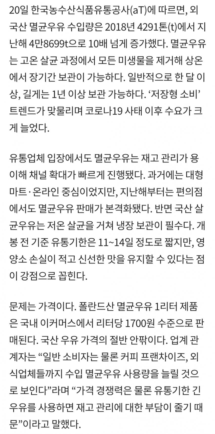 다들 물타고 고급화랍시고 가격 올리는 한국 우유 말고 내년부터 수입멸균우유 사먹도록 하자