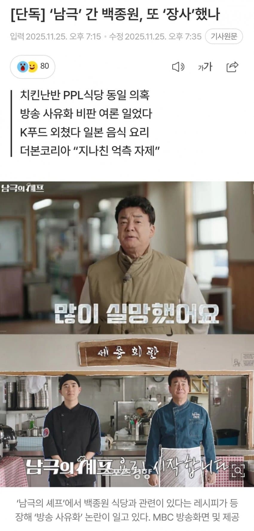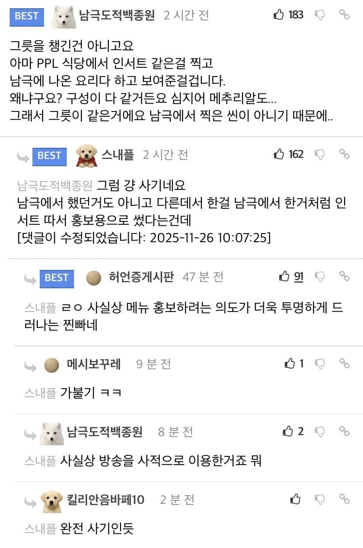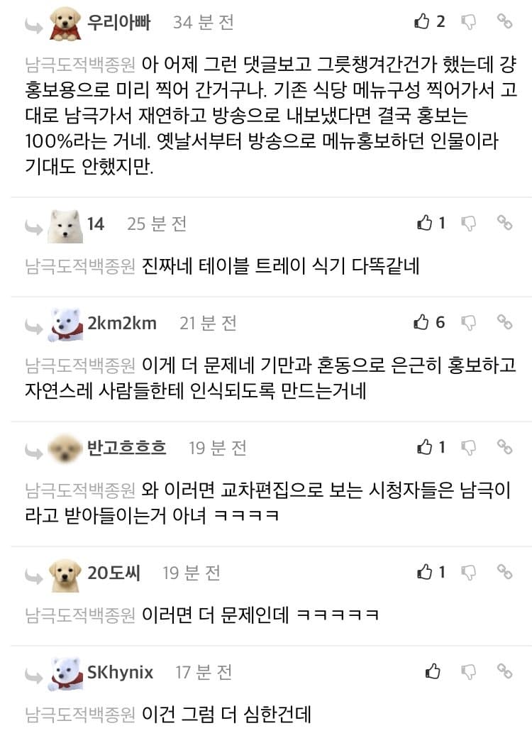 진지)아니 근데 이거 방송하기 전부터백종원 관련 논란이 많았던거 아님??그럼에도 강행촬영 & 방송 하는건데구설수 올랐던 만큼 더 조심했어야 하는거 아닌가?같은 메뉴야 뭐 부대찌개나 칼국수 이런것 처럼메뉴야 같을수 있어도한상 구성이 그릇까지 똑같은건 좀 심하네..심지어 신선한 야채 없다면서양배추 위에 초록색 야채로 포인트 준것까지 똑같네;;