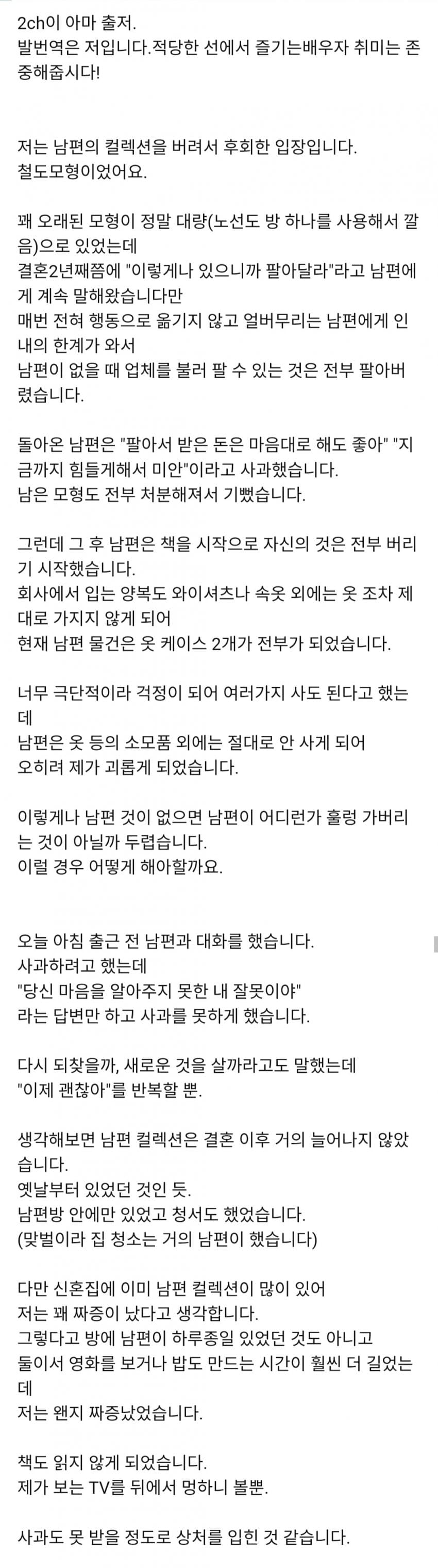 외국여자들이여도 한글패치된 애들은 남편 취미 존중 안해줌. 그렇다고 남편 물건 버리거나 중고로팔아버리는 짓은 안함. 걍 하루종일 삐진척만 ㅈㄴ게 할 뿐임