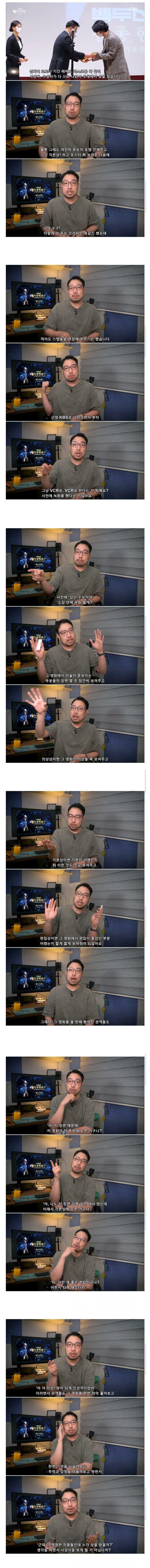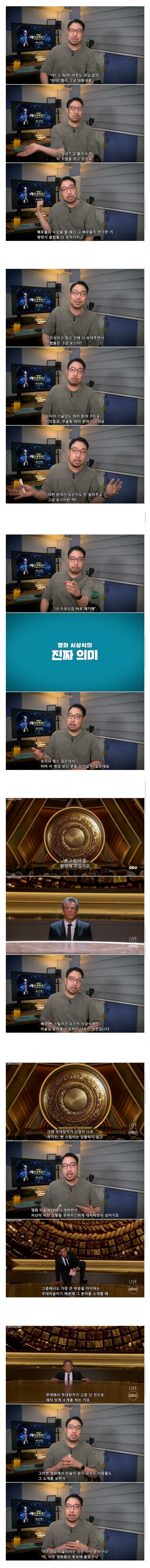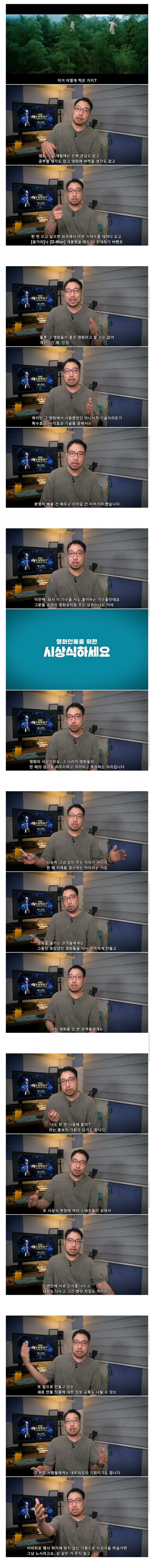 해외가 한다고 그게 무조건 맞는 방식인가? 우리나라에 안 맞는 정서일 수도 있는 건데 웃기네.. 오히려 우리나라는 영화 안 봤던 사람들, 시청자들도 같이 즐길 수 있는 축제의 장이라 좋다는 평도 많음 막말로 얼굴 이름도 모르는 일반인들은 그냥 우리한테 동네 아저씨인데 그런 사람들 상 받고 노잼 수상소감 하는 걸 볼 이유가 있음? 요즘 1인 크리에이터 시대니까 본인이 그럼 초청해서 인터뷰 따고 상도 직접 만들어주고 하면 되잖아