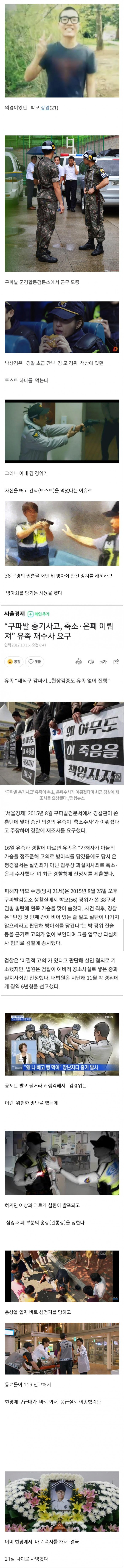 박 모 경위(54)가 구파발 군경합동검문소 제 1생활실[2]에서 의경 3명이 자신을 빼고 토스트를 먹었다는 이유로 가지고 있던 38 구경의 권총을 꺼낸 뒤 방아쇠 안전 장치를 해제하고 방아쇠에 손가락을 건 뒤, 박 모 상경(21)의 왼쪽 가슴에 총을 겨누고 발포하였다