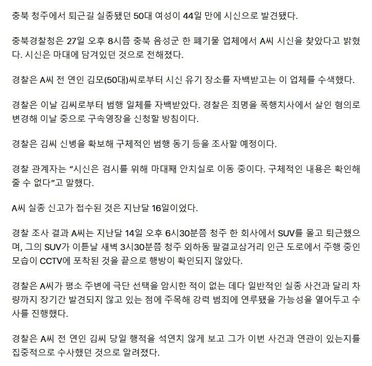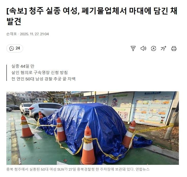 청주 실종 여성, 폐기물업체서 마대에 담긴 채 발견