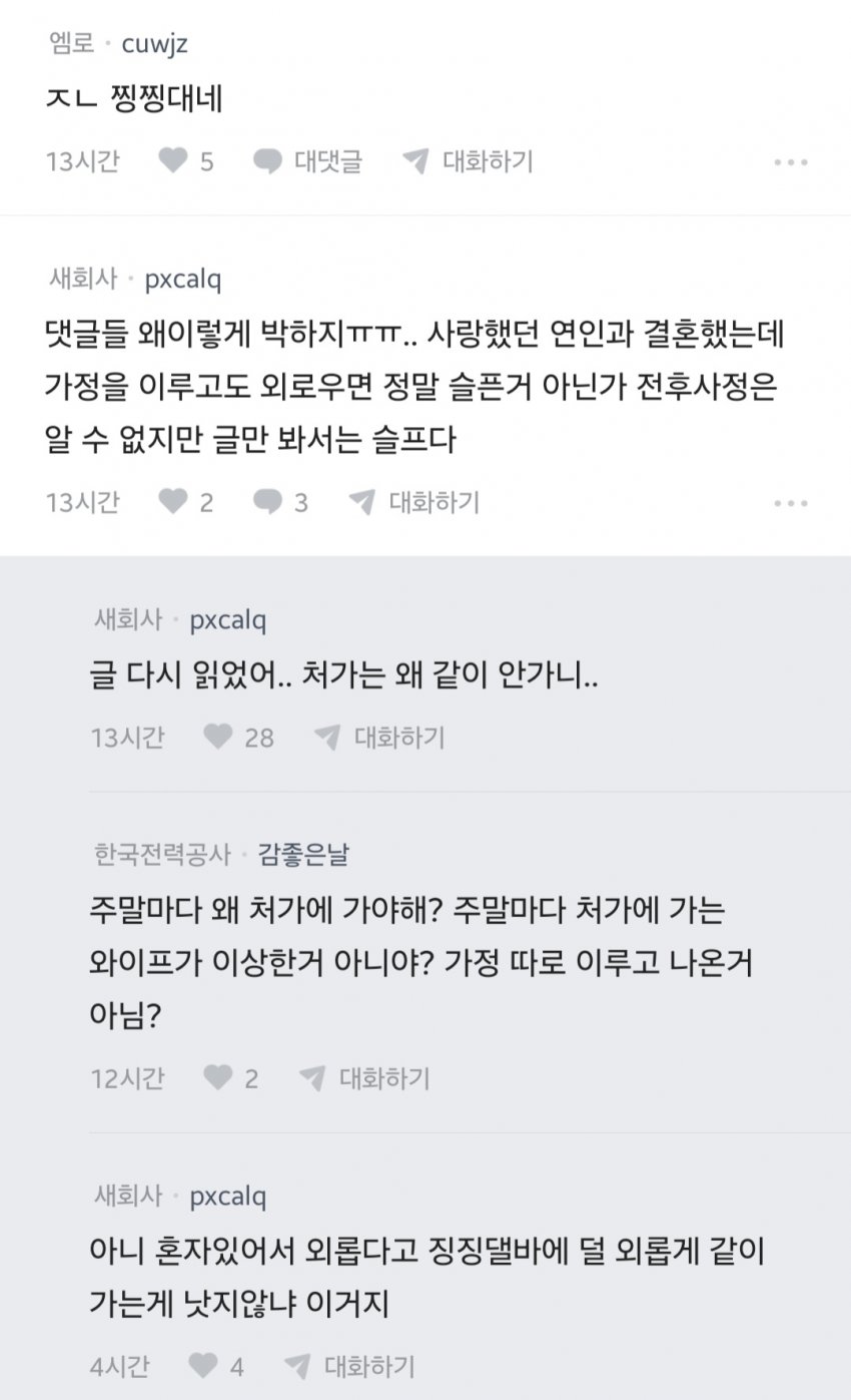 안 사랑하는데 정으로 결혼하니 그렇지그냥 여자한텐 저 남자는 돈벌어오는 동거인인데 감정적 교류가 있을리가 없지