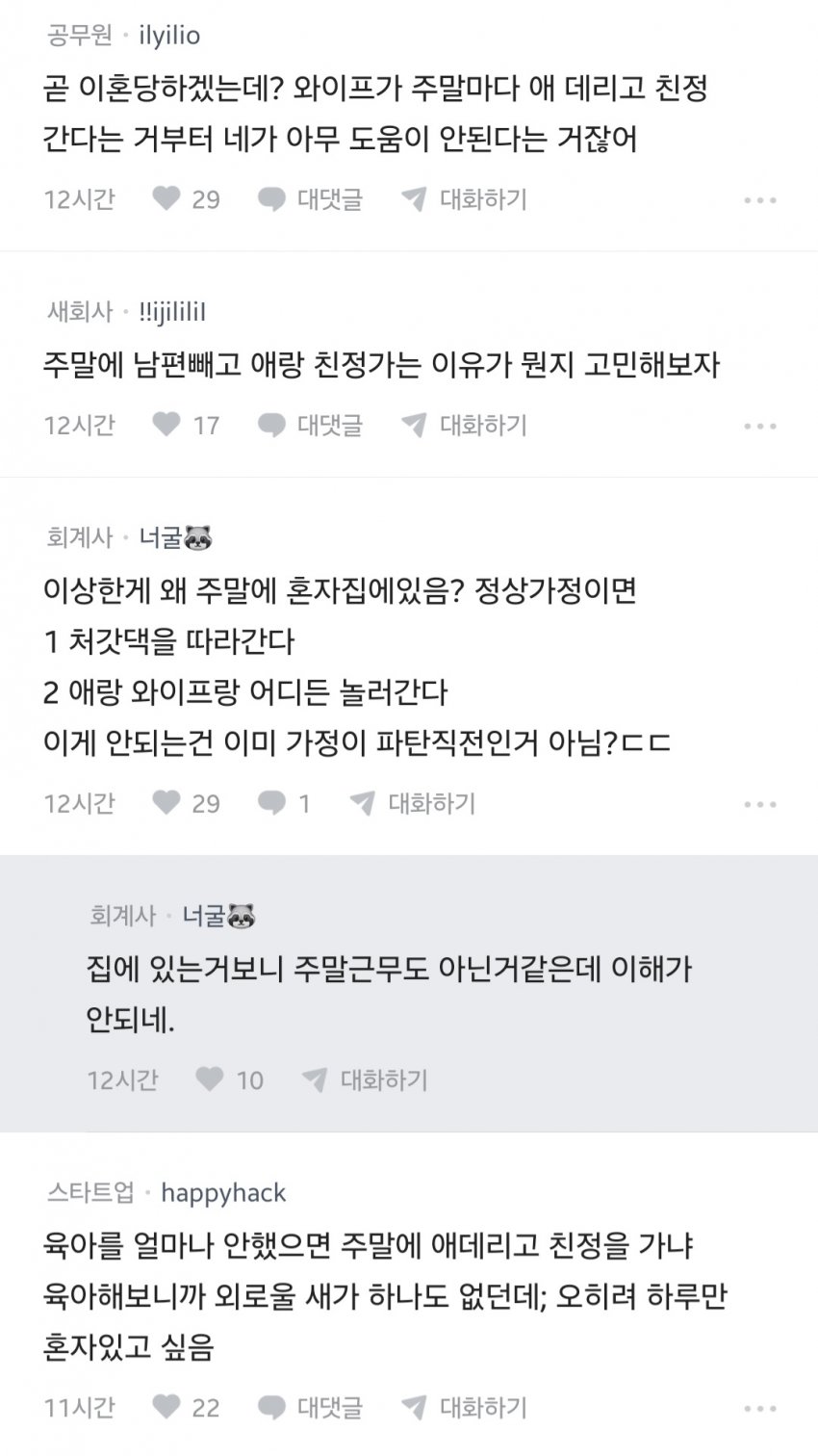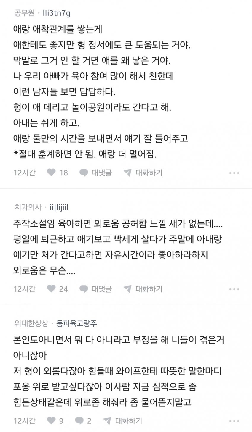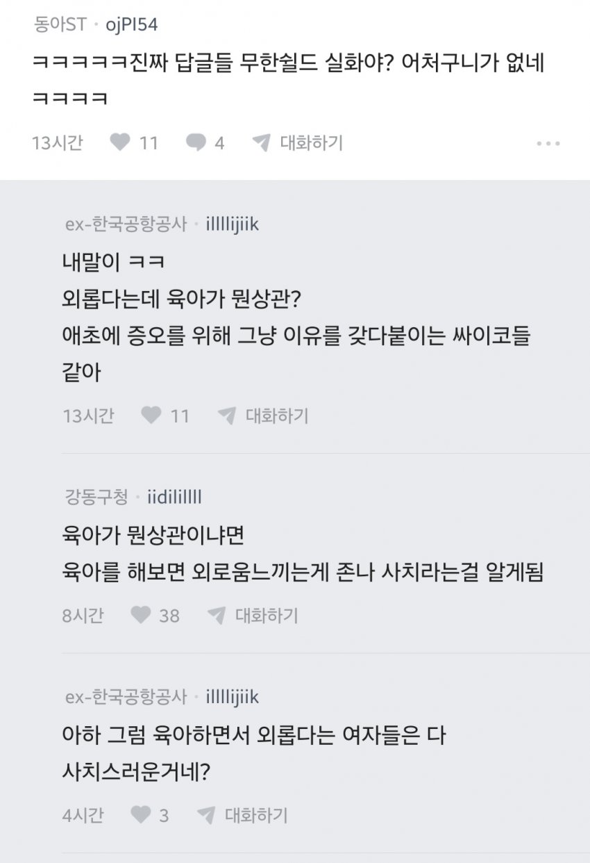애 보면 안 외로울거 아냐 전업주부는 애하고밖에 대화 못하는데 회사에선 뭐함 회사에서 어른하고 대화하라고