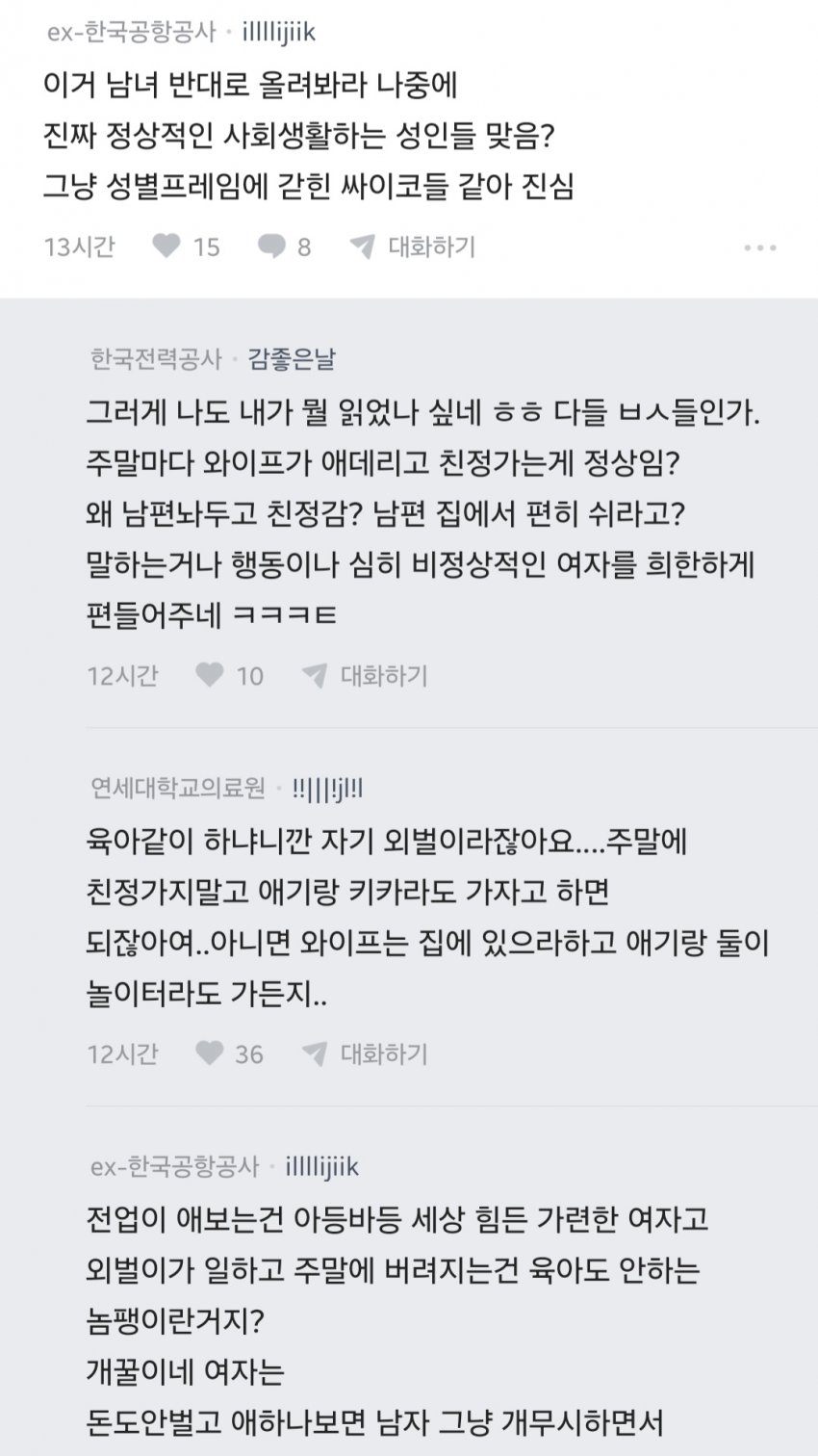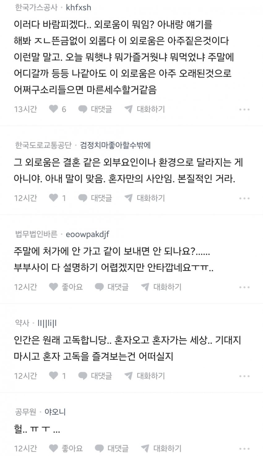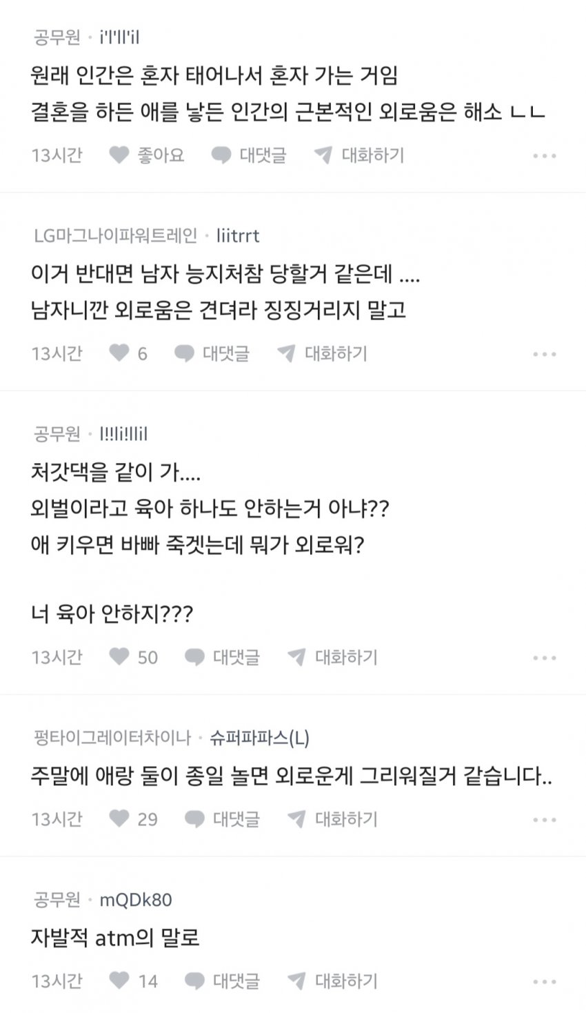 애 보면 안 외로울거 아냐 전업주부는 애하고밖에 대화 못하는데 회사에선 뭐함 회사에서 어른하고 대화하라고