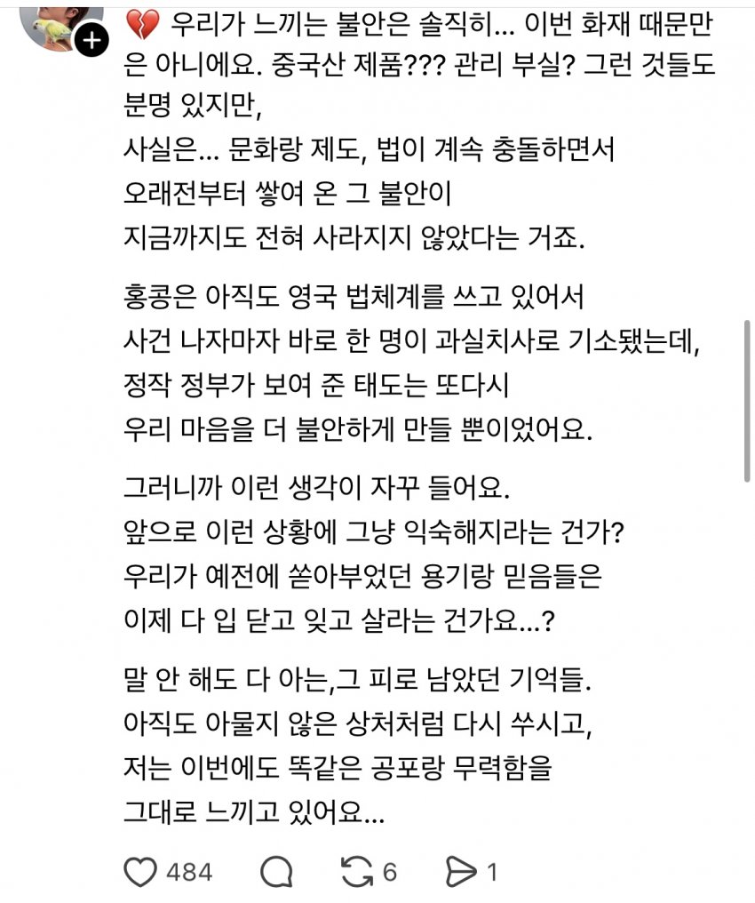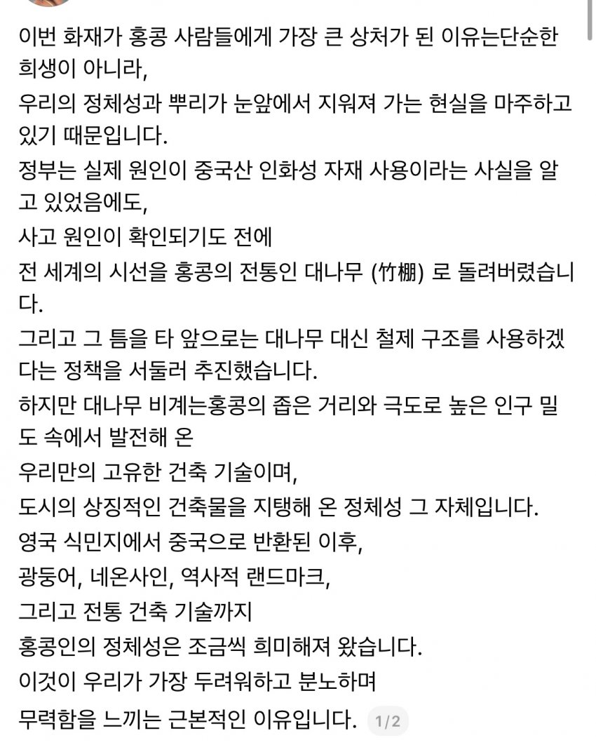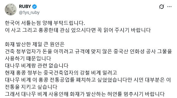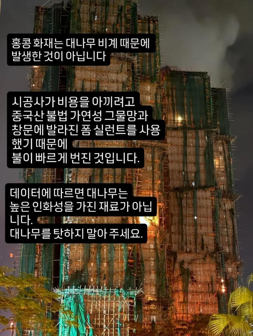 그러게 대나무는 멀쩡하더만 조악한 그물이랑 창문에 처바른 가연성 스티로폼이 원인이네애당초 그 비좁은 홍콩거리서 사람이 운반할꺼 생각하면 대마무 비계는 효용이 좋은듯