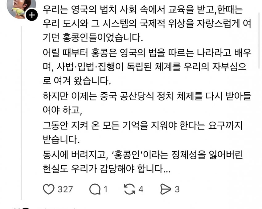 홍콩 정체성 지워지고 시진핑에 조아리고 나라바치는 태도가 이재명 보는 것 같냐