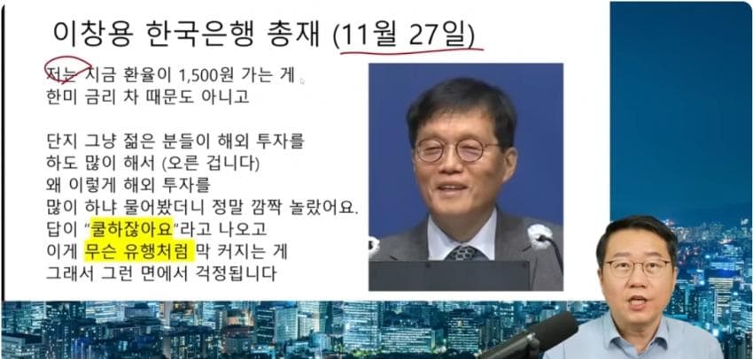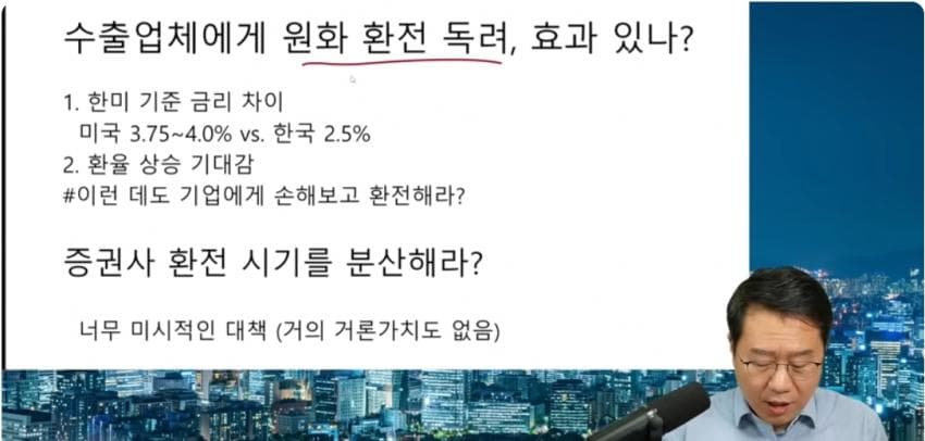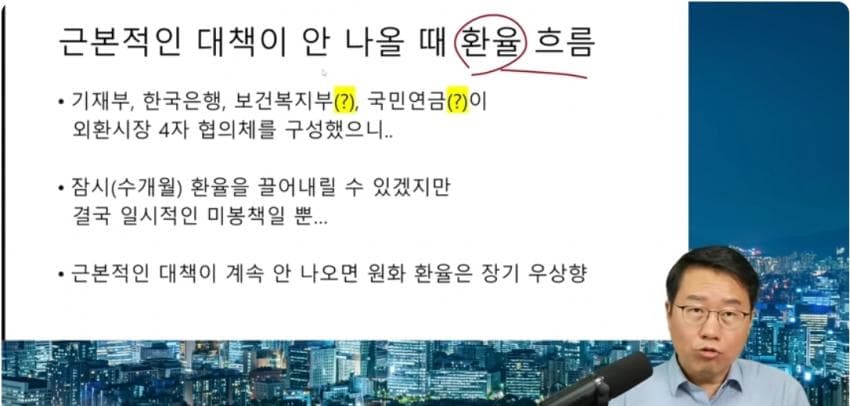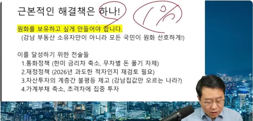 앞에 주접떠는 건 의미없는 소리고 해결책이랍시고 내놓은 것만 보고 상식적으로 판단하면 된다 금리인상->pf와 가계부채리스크 / 원화투자 자산 가치 재고->코스피 사랄땐 안쳐사고 이제와서 이딴 개소리함? / 재정긴축->ai전환기 전력이나 데이터센터 인프라 투자 감소 / 가계부채 축소? 이건 뭔 개소리를 쳐하고 있냐 가계부채 때문에 금리를 못올리는건데? 해결방안이라고 내놓은 전부가 일고의 가치없거나 불가능한 개소리들임 정부가 할 수 있는 건 연금 동원해서 연준 금리인하와 엔화강세 전환까지 존버하는 거임 그거 말고 할 수 있는게 없으니 한은총재 입장에서 외화유출에 대한 구두개입하는거고
