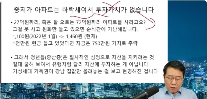 지금 양극화 현상(강남집 부동산 부자 vs 전세, 월세)이 건국이래 최대로 벌어질 조짐이 보이고 있음. 그냥 부동산 가격만 오르는게 아니라 환율 영향으로 소비자 물가도 오르고 있어서.. 월급 상승이 이거 절대 못따라감. 애초에 대출규제로 부동산 묶어버린게 환율 상승을 예측하고 묶어버린게 아닌지 의심스러움.. (솔직히 각종 지표, 자료 다 고위공무원들은 확보할 수 있었고 그거 따라서 예상 못하면 자격이 없지..) 다른 댓글에 부동산 하락을 시켜야한다는데 절대 안됨. 환율 높으면