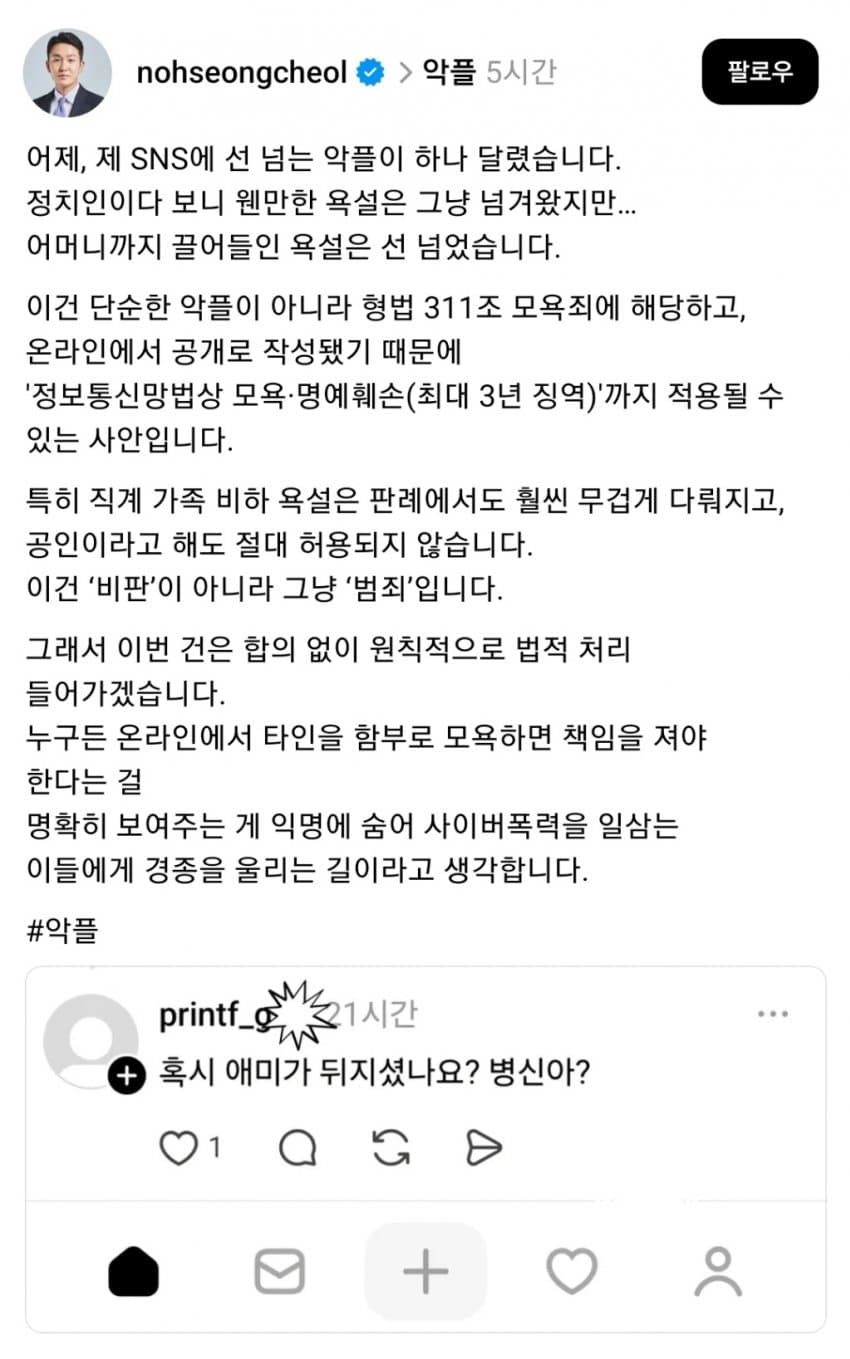 정치인들은 악플 신경 안 쓰는 걸 넘어 무관심보다 낫다고 생각하는 부류인 줄 알았는데 일일이 저런 걸 찾아보고 법적 조치까지 한다니.