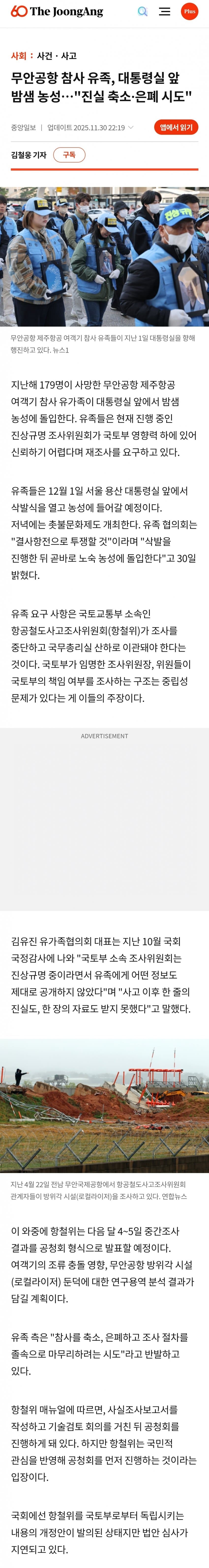 무안공항 참사 유족, 대통령실 앞 밤샘 농성…"진실 축소∙은폐 시도"