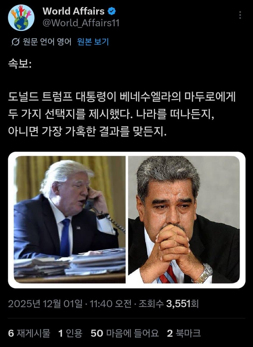 트럼프 마두로축출은 살상,공격 명분확보용이고 실제로는 트럼프 자기 정치적 기반 다시 다지고 베네수엘라 원유탈취용임ㅇㅇ 말그대로 그냥 핑계대고 "침략전쟁" 일으키는거 미국믿지마라ㅇㅇ