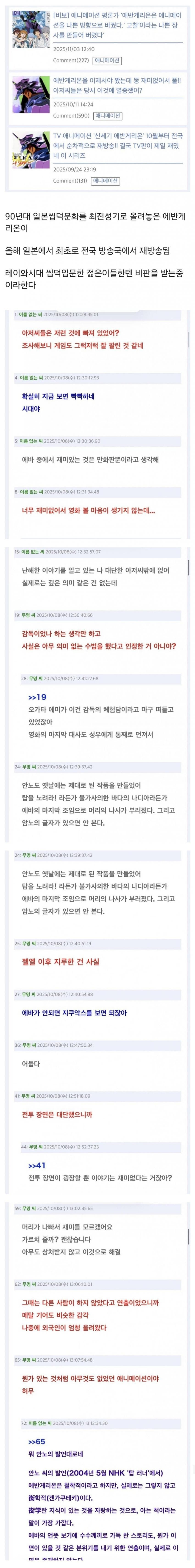 그땐 나름 재밌었고 청소년기 감성 폭주하는 애들한텐 사색거리로 굉장했고 90~00년대 특유의 수박 겉핥기 식 개똥철학 범벅이라 자극적이었긴 함. 근데, 올려치기가 넘 심했고 팬덤의 완장질, 지나친 타 작품 까내리기 등이 심해서 반감도 컸었던 터라 저런 평가 받는건 신기하지 않음. 한창때 진격의 거인도 비슷했는데 감성 건드리면서 겉만 그럴싸한 철학 좀 포장해서 퀄리티 있는 애니 만들면 빠들이 심하게 몰입하고 패악질 부리긴 함
