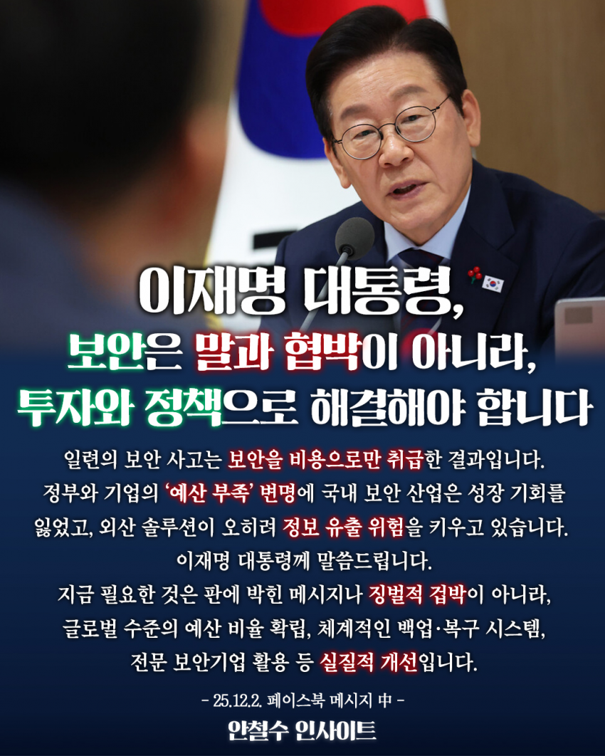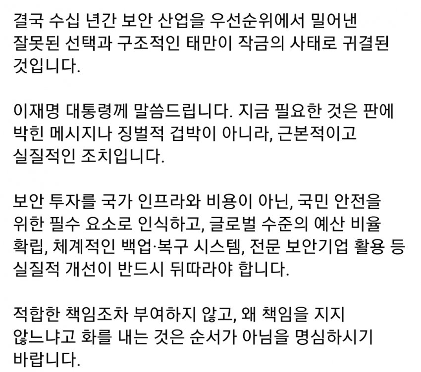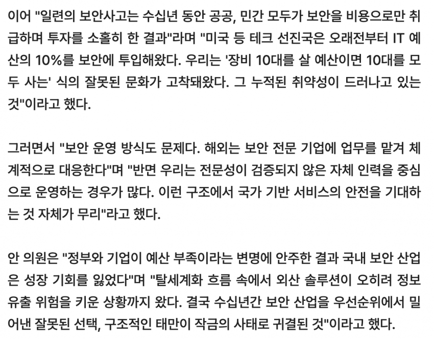 뭐 어쩌라는거임? 아니 보안에 투자는 쿠팡에서해야지. 그걸 국민세금써서 정부예산으로 쿠팡보안해달라? 지 안랩 국가세금로 성장맛 한번 보더니 또 돈달라고 시동거네