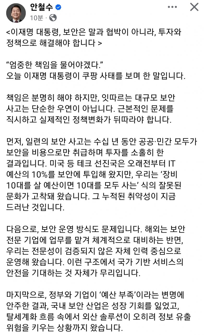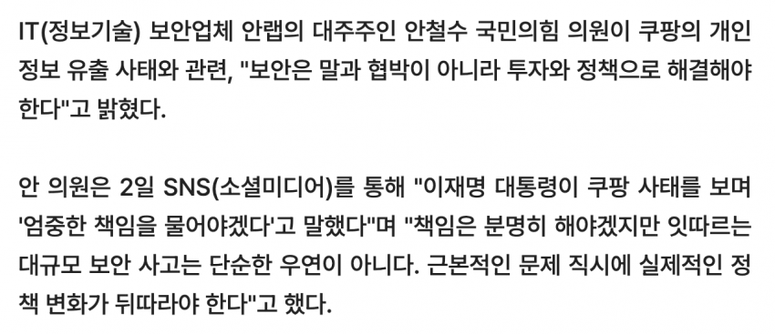 '안랩 대주주' 안철수, '쿠팡 사태'에 "전문 보안기업 활용해야"