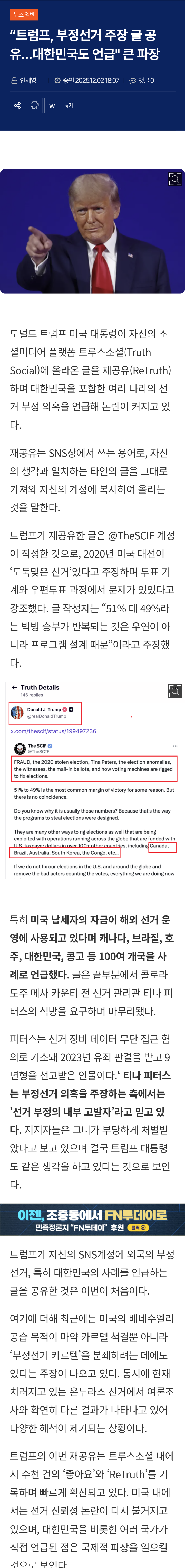 “트럼프, 부정선거 주장 글 공유…대한민국도 언급" 큰 파장