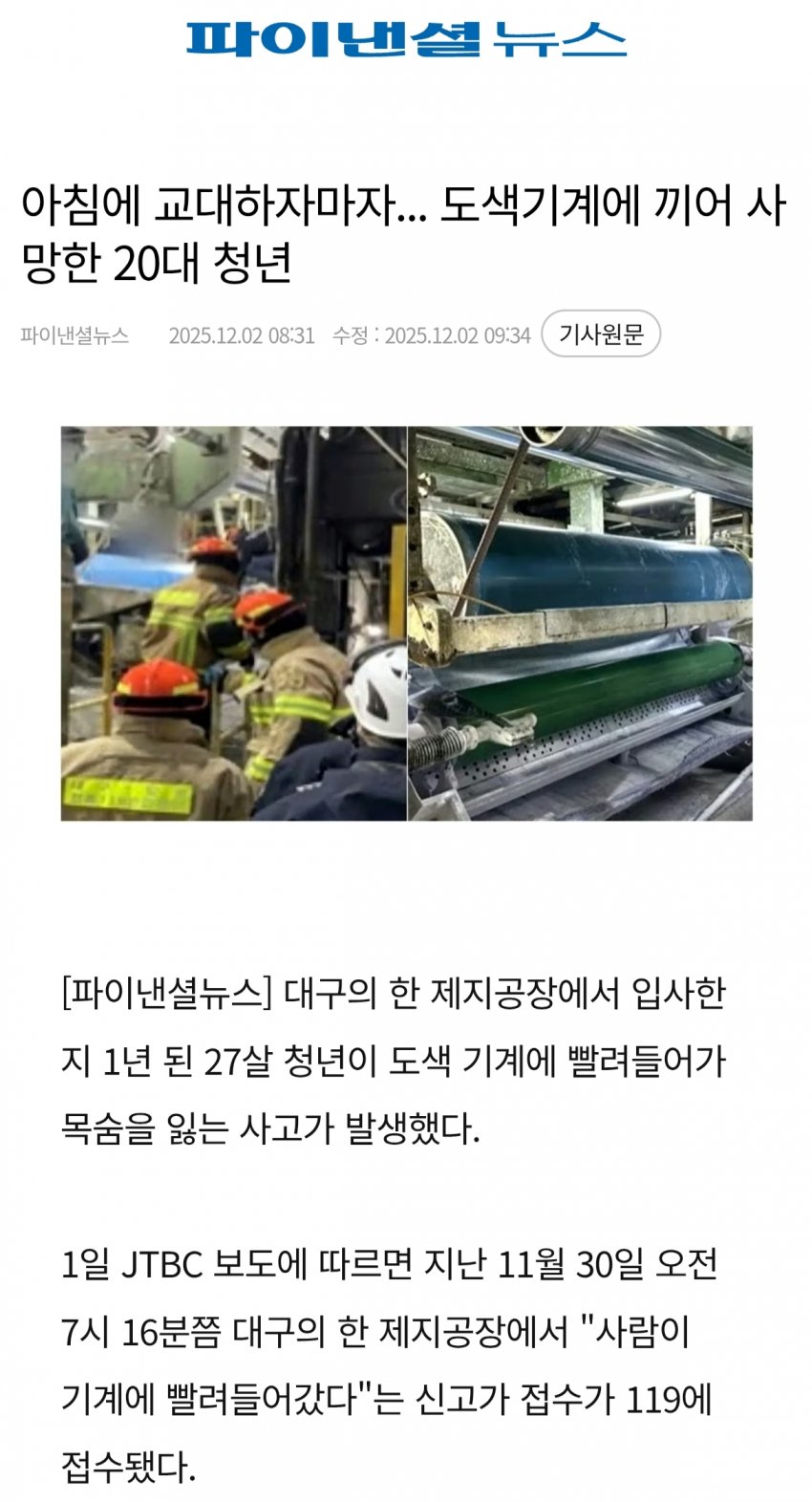 교대하자마자.. 도색기계에 끼어 사망한 20대 청년