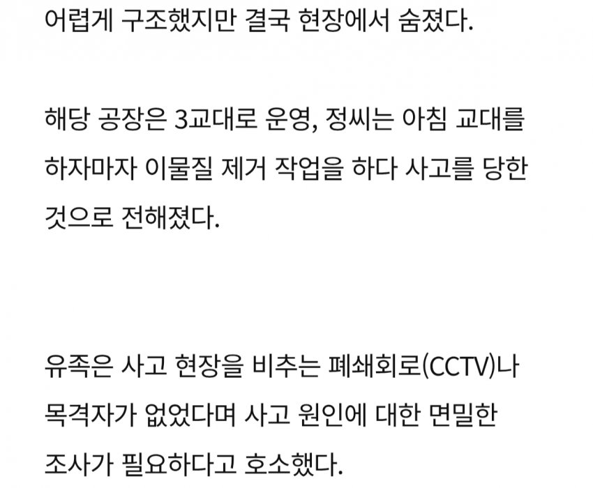 사람 죽이려면 씨씨티비없는 공장에서 기계작동시키면 되겠네 뭐 저따위로 운영하노