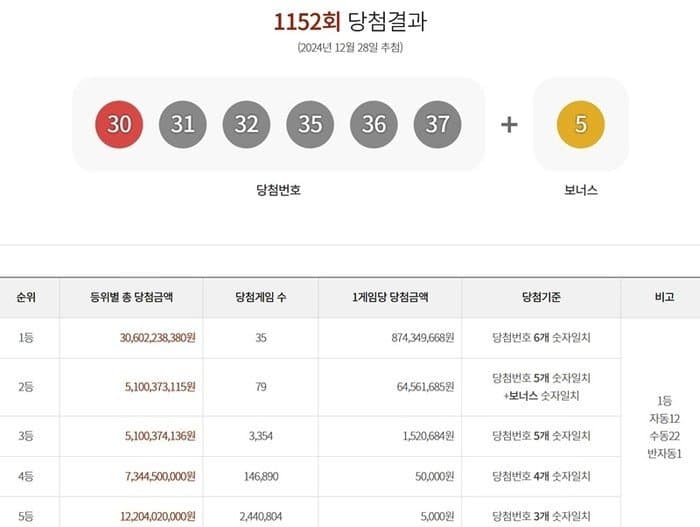 때는 24년 마지막 로또 추첨인 1152회차