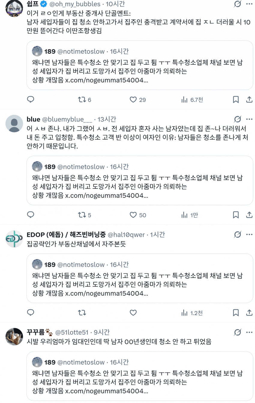 실제 작업자들 청소업체 대표가 실제 수백 수천건의 경험을 들은 사례 vs 인터넷 뇌피셜 하여튼 남자가 더럽다