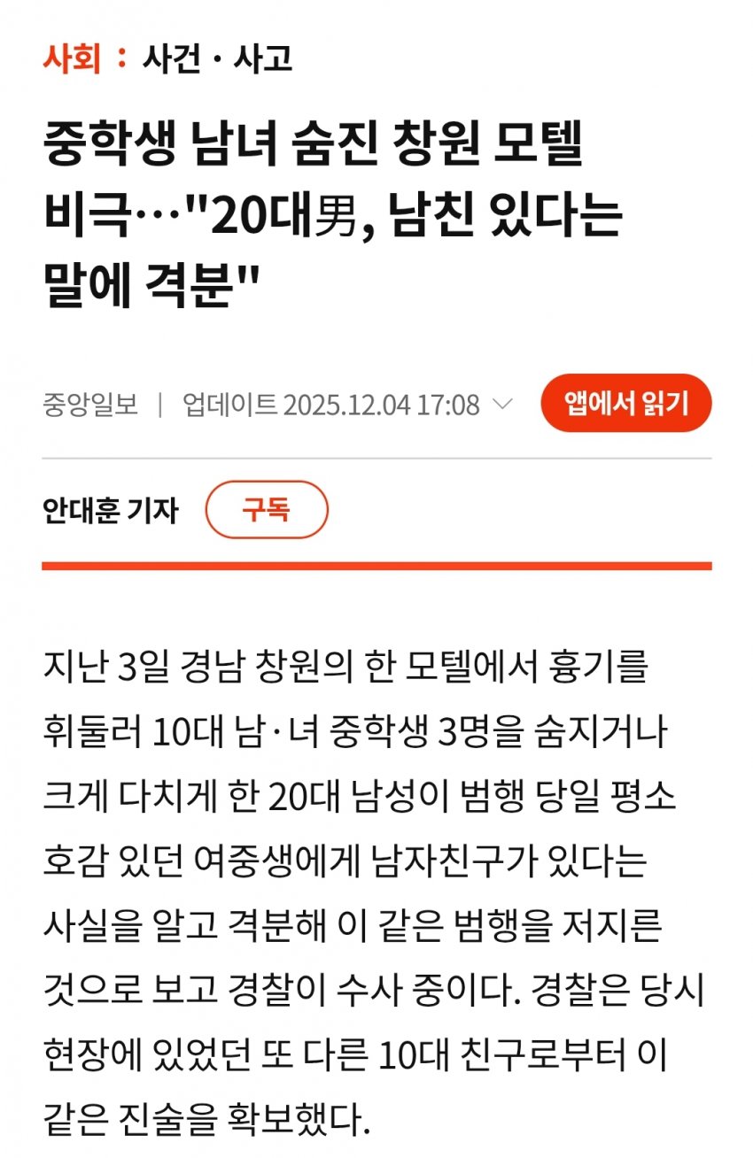착각들 하는게 있는데 이 사건에 여중딩은 두명임 두명이서 모텔겄다가 한명 가라고 해서 간거 그 뒤에 남중딩 두명이 갔다가 칼찌맞음