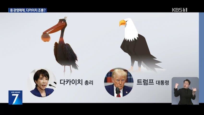 여기서 펠리컨은 다카이치 총리를, 독수리 아저씨는 미국을 상징하는 것으로 해석됨