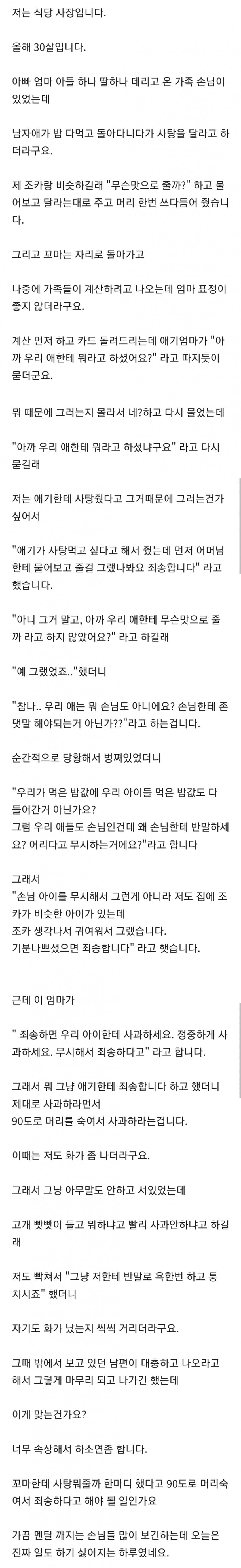 아무리 손님이어도 개소리 지껄이면 죄송하다고 할 필요가 없지. 꼬마한테 반말한게 뭐가 어때서?? 왜 죄송하다고 하냐 첫단추부터 잘못꿰었네. 꼬우면 꺼지고 오지 말라는식으로 말해야 맘충들 다 걸러지고 가게 손님들도 최소한의 교양있는 사람들이 온다