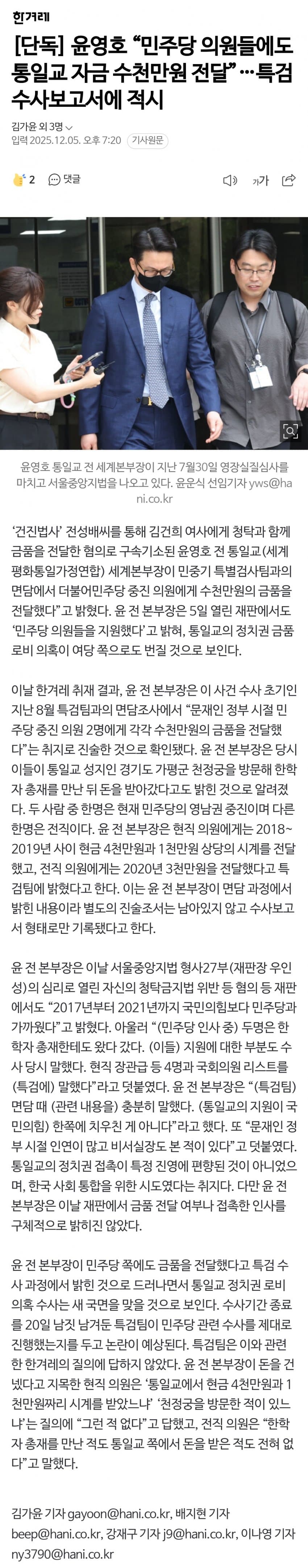 [단독] 윤영호 “민주당 의원들에도 통일교 자금 수천만원 전달”