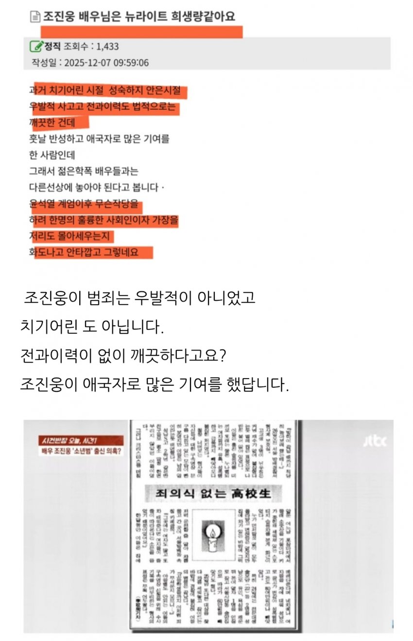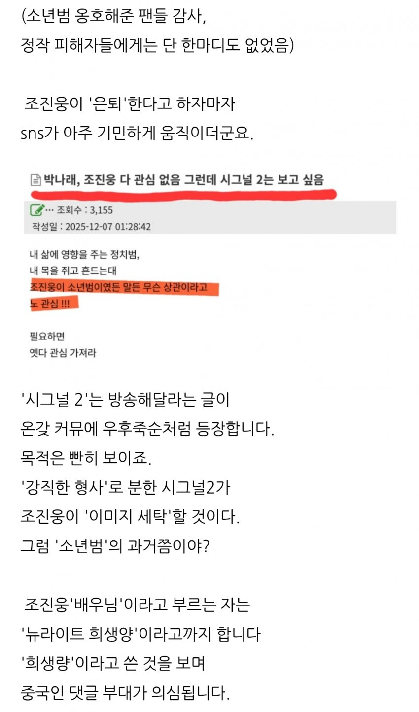 조진웅을 구하려고 한다기보단, 조진웅을 계속 입방아에 오르게 해서 사람들 시선쏠리게 하는게 목적이지. 애초에 꼬리자르기 한게 좌파의 높으신 분들이잖아