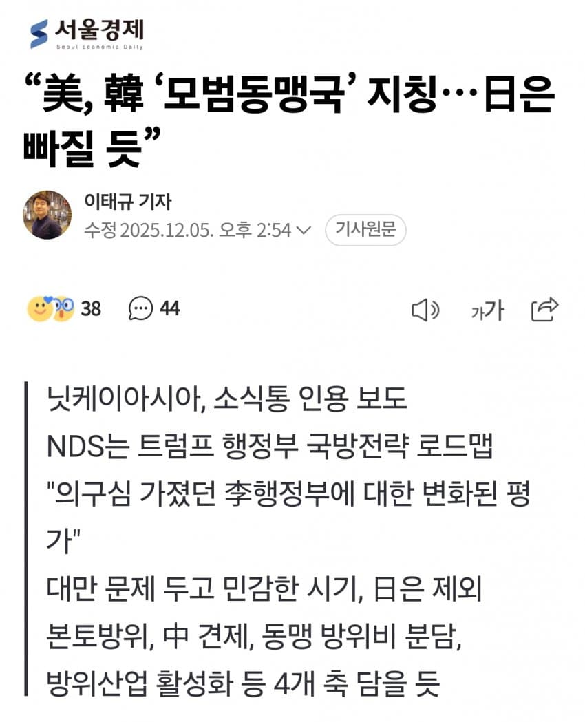 트럼프 행정부는 전날 국가안보전략 NSS을 공개했는데, 여기엔 집단 방위 기여도가 높은 동맹에는 상업적 우대와 기술 공유 등 특혜를 제공하겠다는 내용이 명시됐음