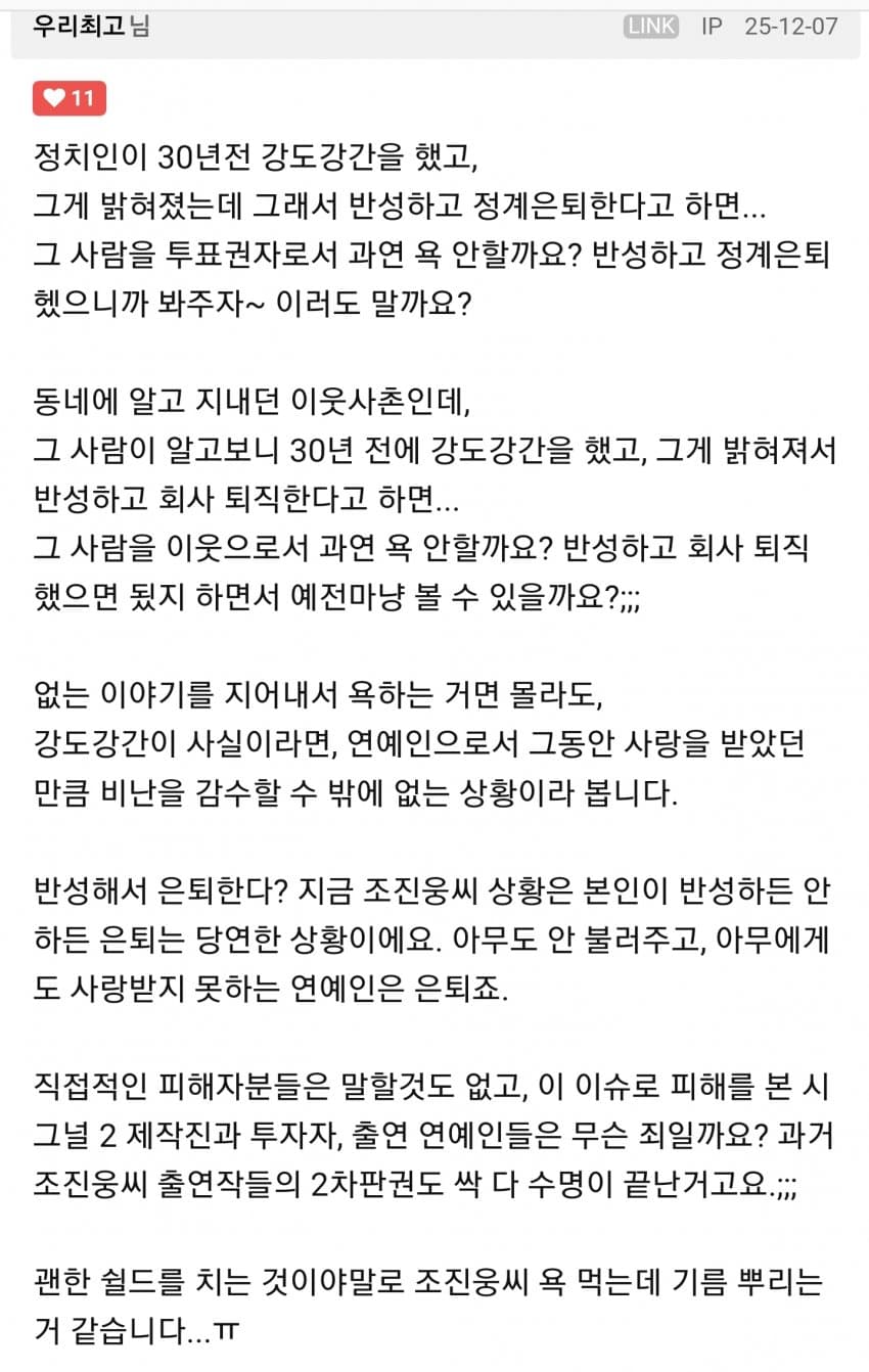 아니다 차라리 조진웅은 부끄러우니까 은퇴선언했다고 쳐도 그딴걸 쉴드치는 본인은 부끄럽지 않은건가? 부끄러움이 뭔지 모르나?