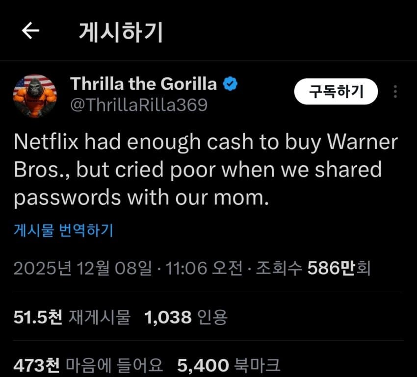 " 넷플릭스 새끼들은 122조 써서 워너브라더스 살돈 있으면서 내가 울엄마랑 비번 공유한다니까