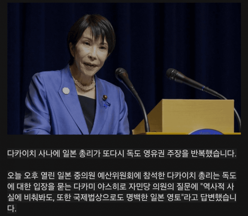 지금 다카이치 일본에서 자국민들 지지율 정점에 올라가있는데 당연히 한국땅입니다 라고 하겄나한국땅인걸 알아도 저렇게 말 할수밖에 없는거겠지그리고 지금 대한민국은 부정선거로 당선된 이재명 가짜정부라 더 그러지