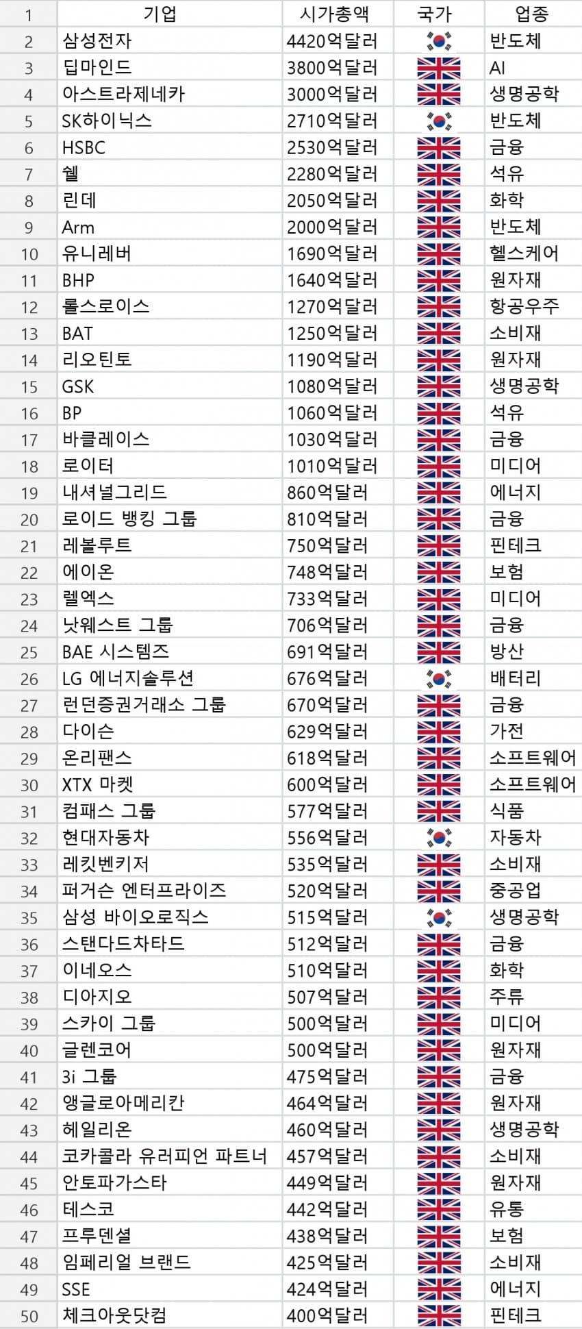 과거 전주딱이자 초강대국이었던 영국의 기업들과 한국 기업들 규모를 비교해봤을때