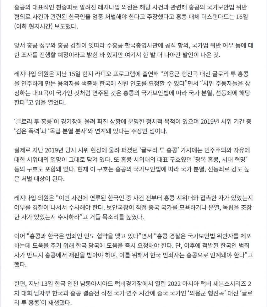 내용이 엉망진창이라 어디부터 말해야 할 지 모르겠지만,글쓴이는 '글로리 투 홍콩'에 대해서 왜 홍콩 행정부가 발광하는 지 몰라서 저런 말 하는 건지... 알면서 저런 말 하는 건지... 혼파망이네