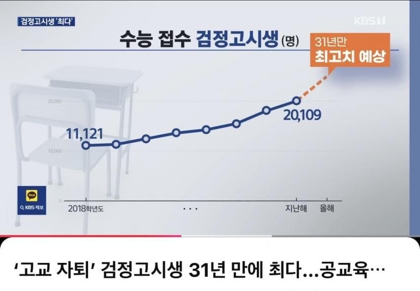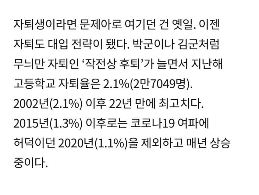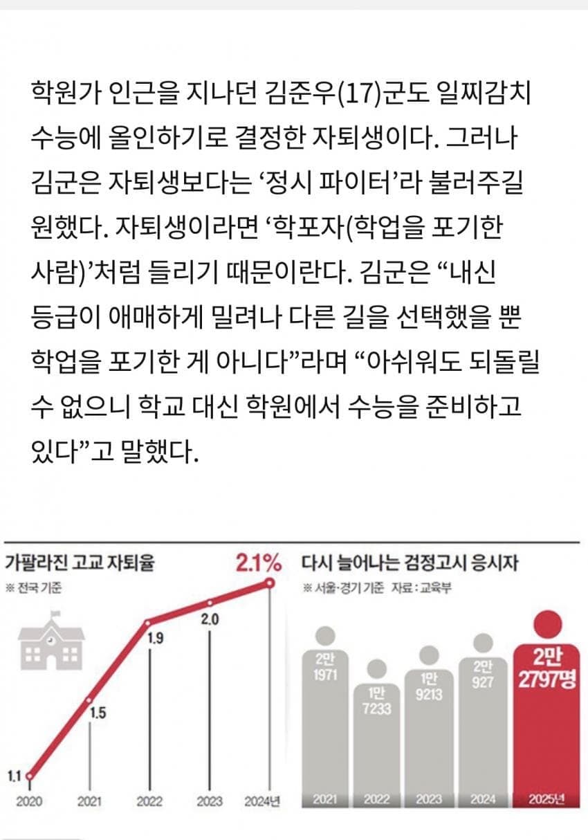 입시 ㅈ도모르는 기레기의 개소리임강남8학군 견제한답시고 수시비중을 계속 늘려왔고 여기에 약자보호라는 이념까지 범벅이되서농어촌,차상위,한부모가정과 같은 백도어들을 비중도 같이 상승하니 입시판에선 대치키즈를 제외하고선 무조건 수시 올인이 정답인 상황임문제는 상대평가이기에 1등급은 퍼센트로 관리되고 경쟁이 계속 심화되어왔는데 이번에 5등급제로 바꾸면서 2등급의 가치가 ㅄ이 되어버림그래서 애초에 1등급 못딸꺼같거나 수시를 한번 망치면 되돌릴수없기에 자퇴박고 정시를 3년 준비하겠다는 전략을 많이 선택하게 된거임
