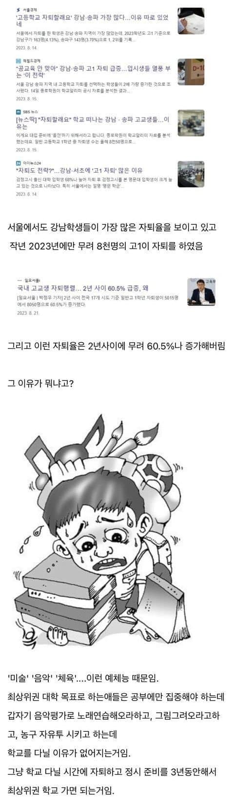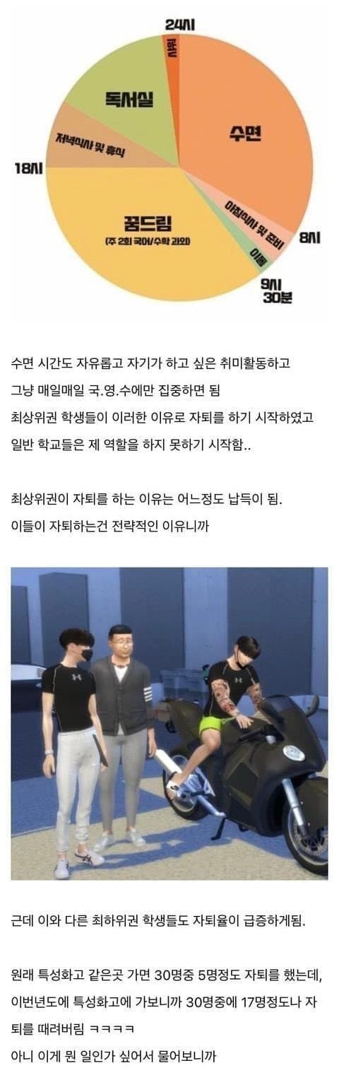 이악물고 학교 학원 교육수준 비슷한데 애들이 예체능 싫어서 튄거마냥 주작 ㅋㅋㅋㅋㅋㅋ 배울게 없어서 어차피 잠이나 자는 학교 포기하는건데