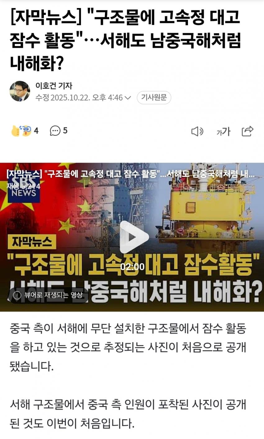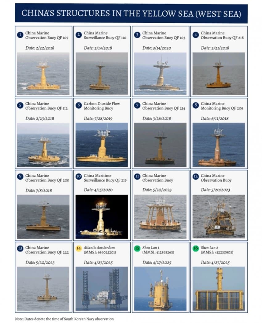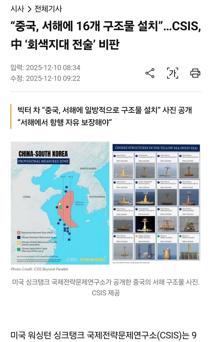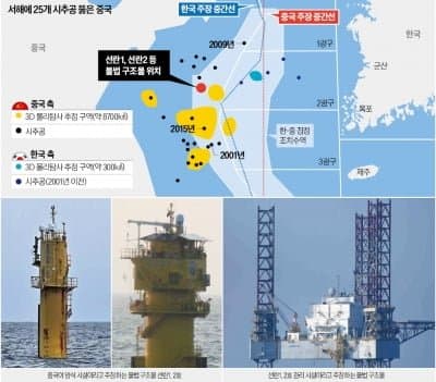 한국에서는 서해에 중국 인공 구조물 3개 생겼다고 기사 떴었는데