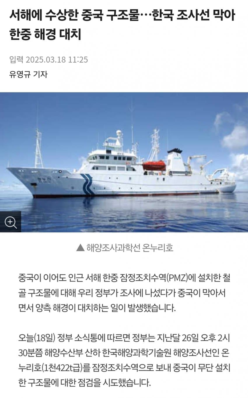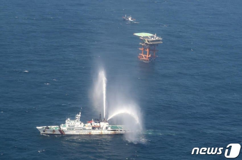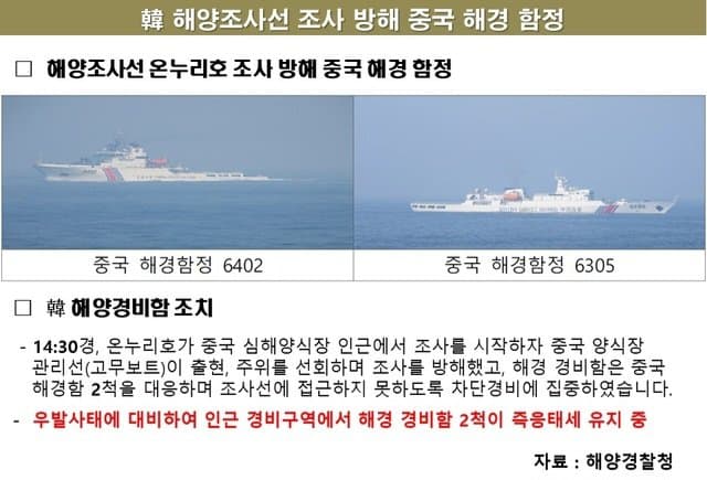 한국 조사선이 중국 해상구조물에 다가가자 즉시 중국 전투함 2척과 경비정 3척 와서 가로막음 ㅋㅋㅋㅋㅋㅋ