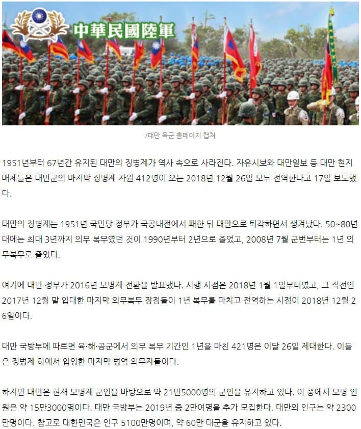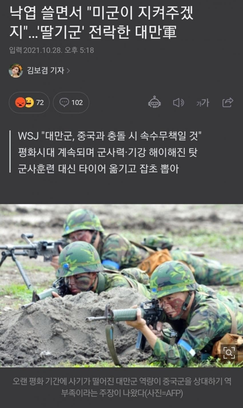 근데 대만 사람들도 알아야하는게 니들 나라 국민들 스스로가 지키려는 의지가 없으면 미국도 어떻게 못함 아무리 돈을 퍼붓고 무기를 지원해주고 군대를 파병해도 정작 그나라 국민들이 의지가 부족하면 이건 서방도 어쩔수없음