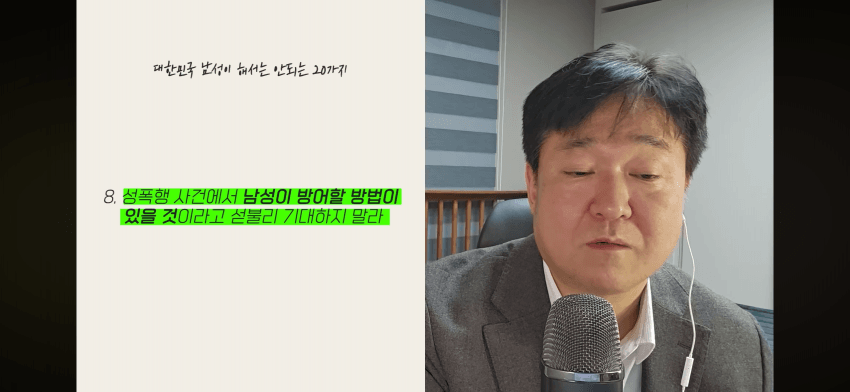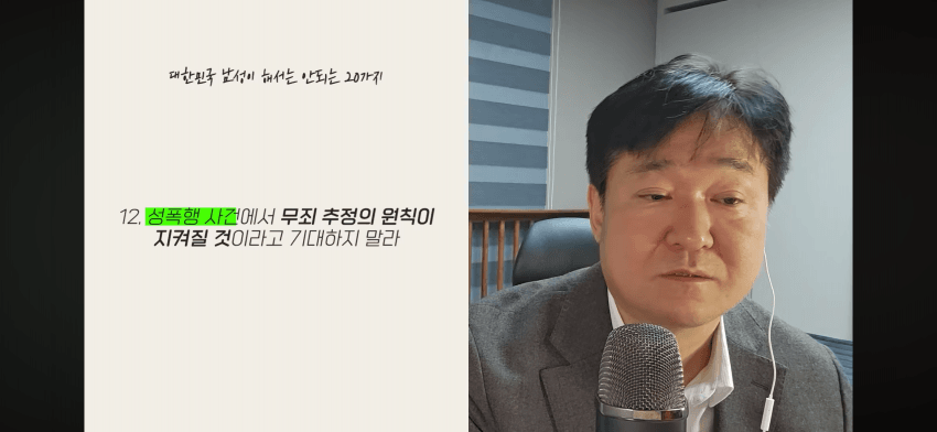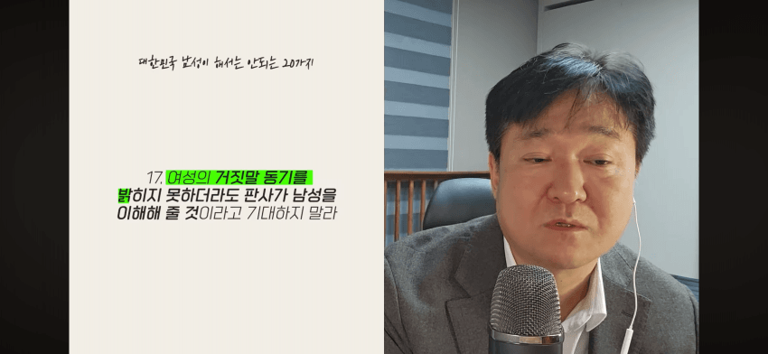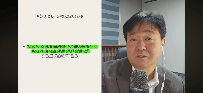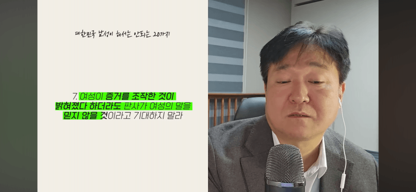 죄다 녹음하면 되긴 하지근데 저 변호사한테 오는 대부분의 남자들은 그걸 못했으니까 재판에서 무고함을 밝혀야 하는거고
