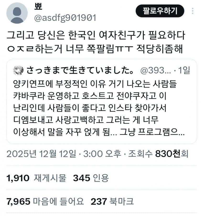 한국여자들이 디엠 보내고 사랑 고백하면서