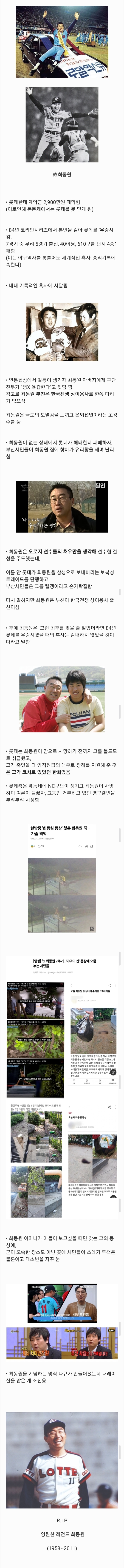 나 초딩 때 야구부 였고 소풍 중에 최동원 시합 있다고 야구부원들 소풍 도중에 야구장으로 ㄱㄱ, 야구장에서 몸풀고 있는 최동원에게 싸인을 요청 했는데, 그 특유의 눈빛으로 한번 쳐다 보고 개 무시 하더만, 세월이 많이 지났음에도 지금도 그 눈빛이 눈에 선 하다는 거, 그후로 최동원에 관한 거 거론 되면 그때가 자동으로 생각남결론; 싸인 좀 해줘라, 특히 애들은 더 더 더
