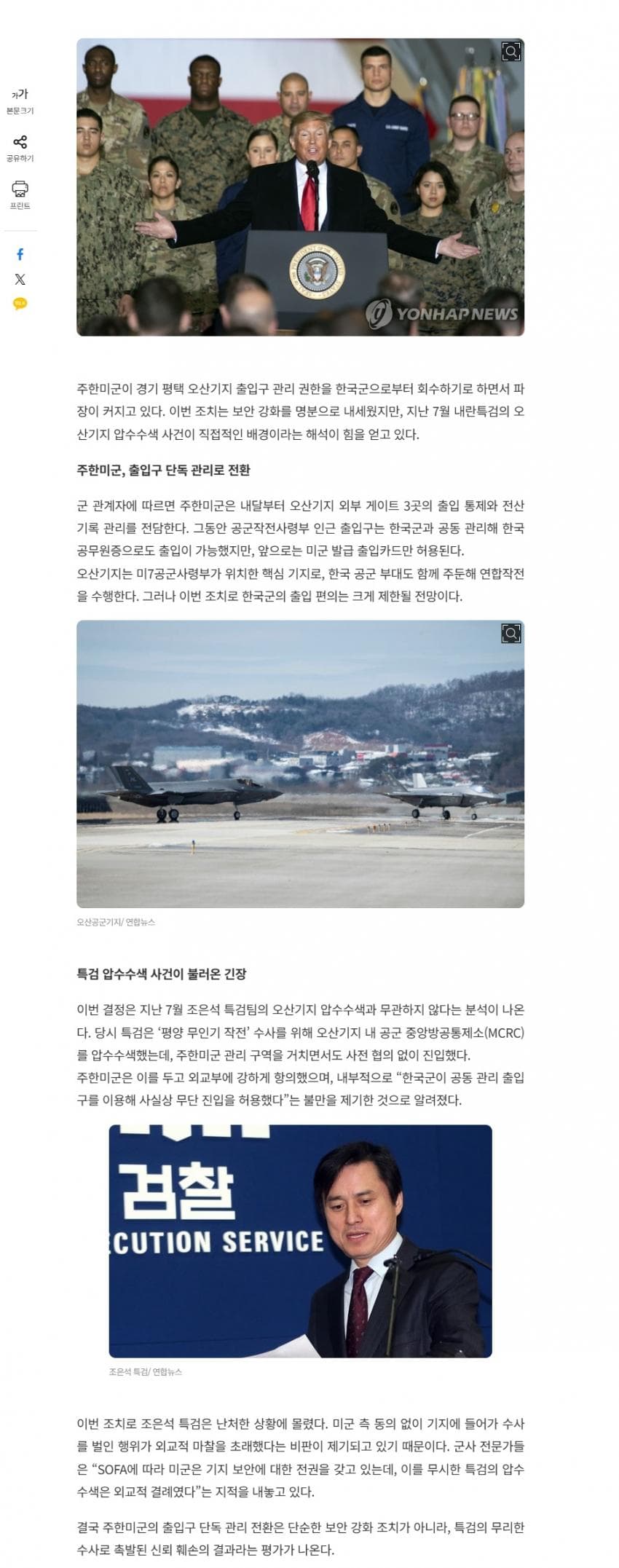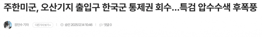 기사링크 :주한미군, 오산기지 출입구 한국군 통제권 회수…특검 압수수색 후폭풍 - 파이낸스투데이