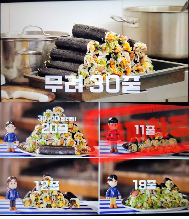 중간에 랍스터랑 초대형떡갈비랑 통돼지구이는 뭐야? 딴사람이 한거임? 저기까지가서 죄다 공산품 재료 때려박고 김밥 싸는거임? ㅋㅋ
