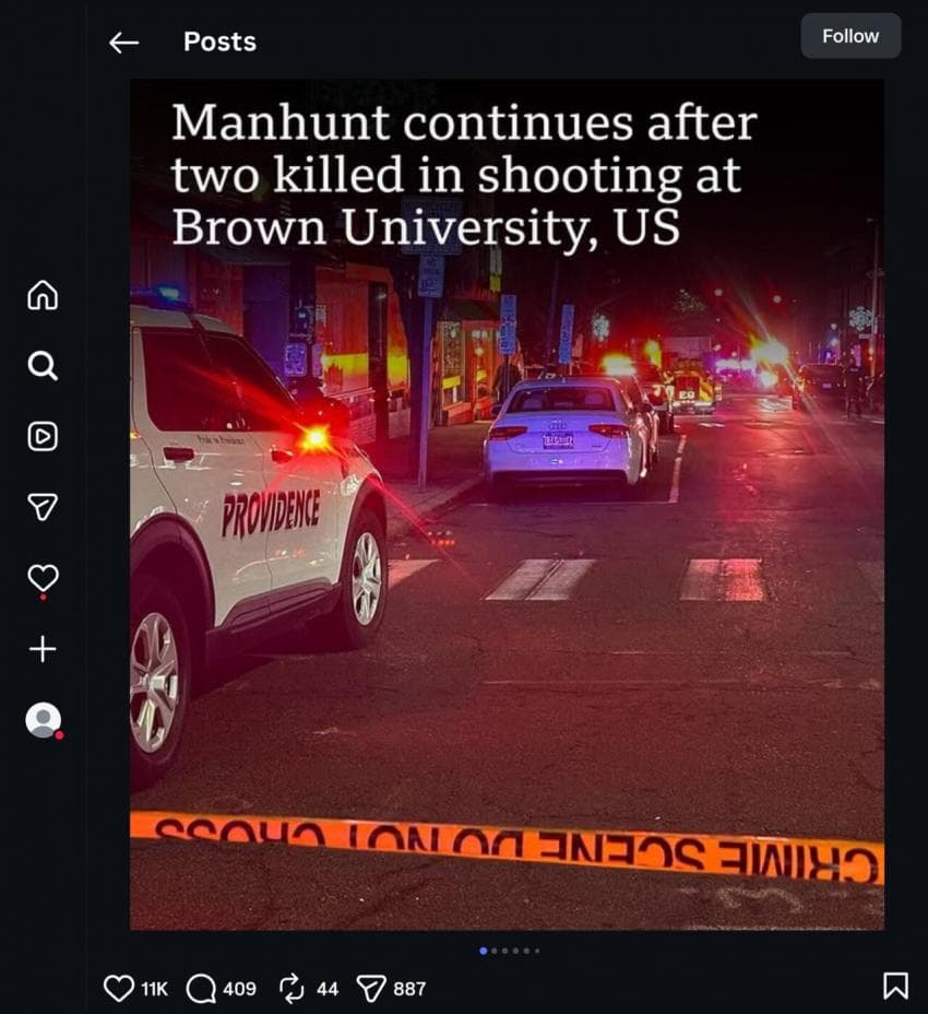 반면 같은 날 발생한 미국 브라운대 총기난사 사건 관련 포스트에는